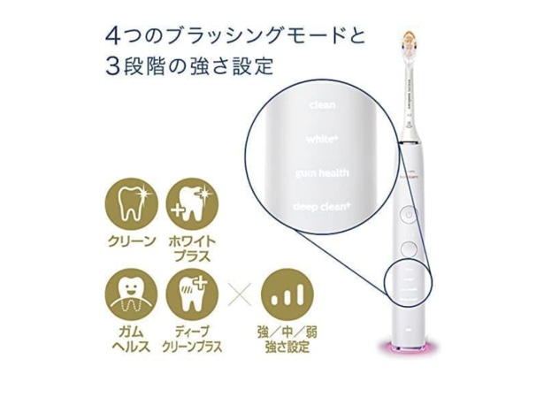 クリーン(基本のブラッシングモード)、ホワイトプラス(ステインを落とし磨き上げる)、ガムヘルス(歯垢を落とし、歯ぐきにやさしい刺激を)、ディープクリーンプラス(心地よい振動で歯垢をしっかり除去)の 4 つのブラッシングモードを搭載。ブラッシングの強さ設定も 3 段階から選べる。